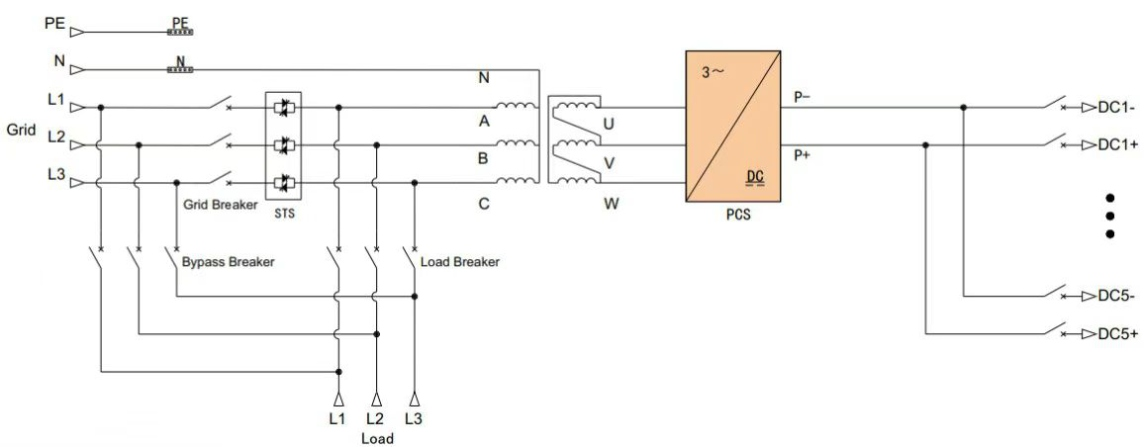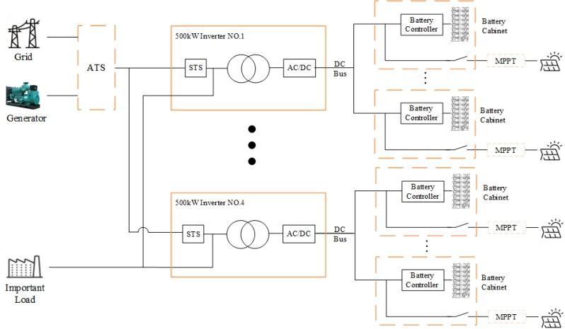 2. 여러 개의 500kW 시스템을 병렬로 작동하고 STSa를 서로 다른 500kW 인버터에 분산시키는 경우 그리드 연결 지점에서 부하 연결 지점까지의 케이블 길이가 일정한지 확인하는 것이 중요합니다.